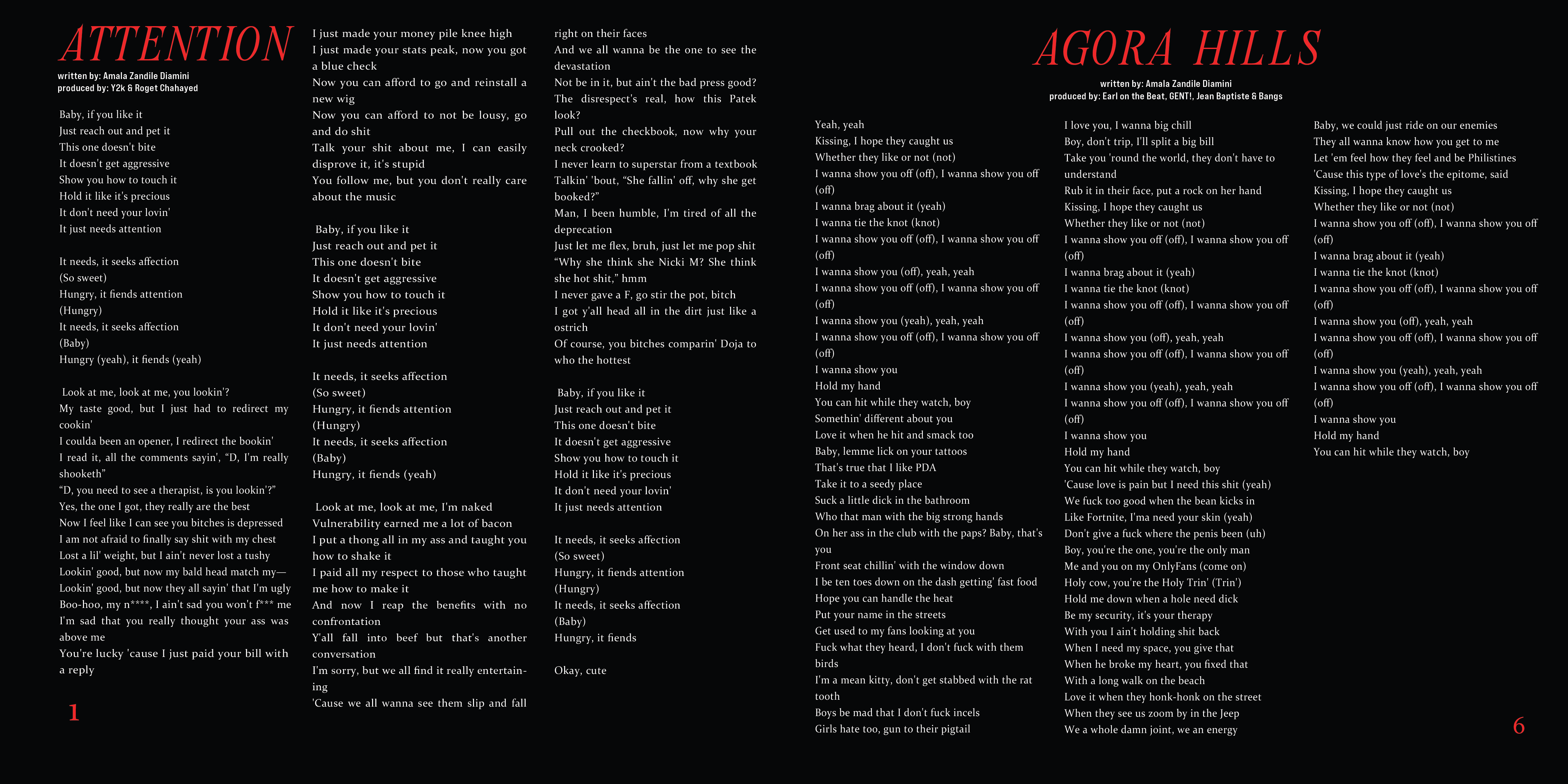 For the lyric booklet, I first needed to understand how booklet binding works since the pages must be arranged in a specific order before printing so they fold and staple correctly along the spine. This meant designing with the final folded structure in mind rather than thinking of the pages sequentially. After understanding the layout system, I selected several songs that represented the album and gathered imagery from their music videos to keep the visuals aligned with the artist’s existing aesthetic.