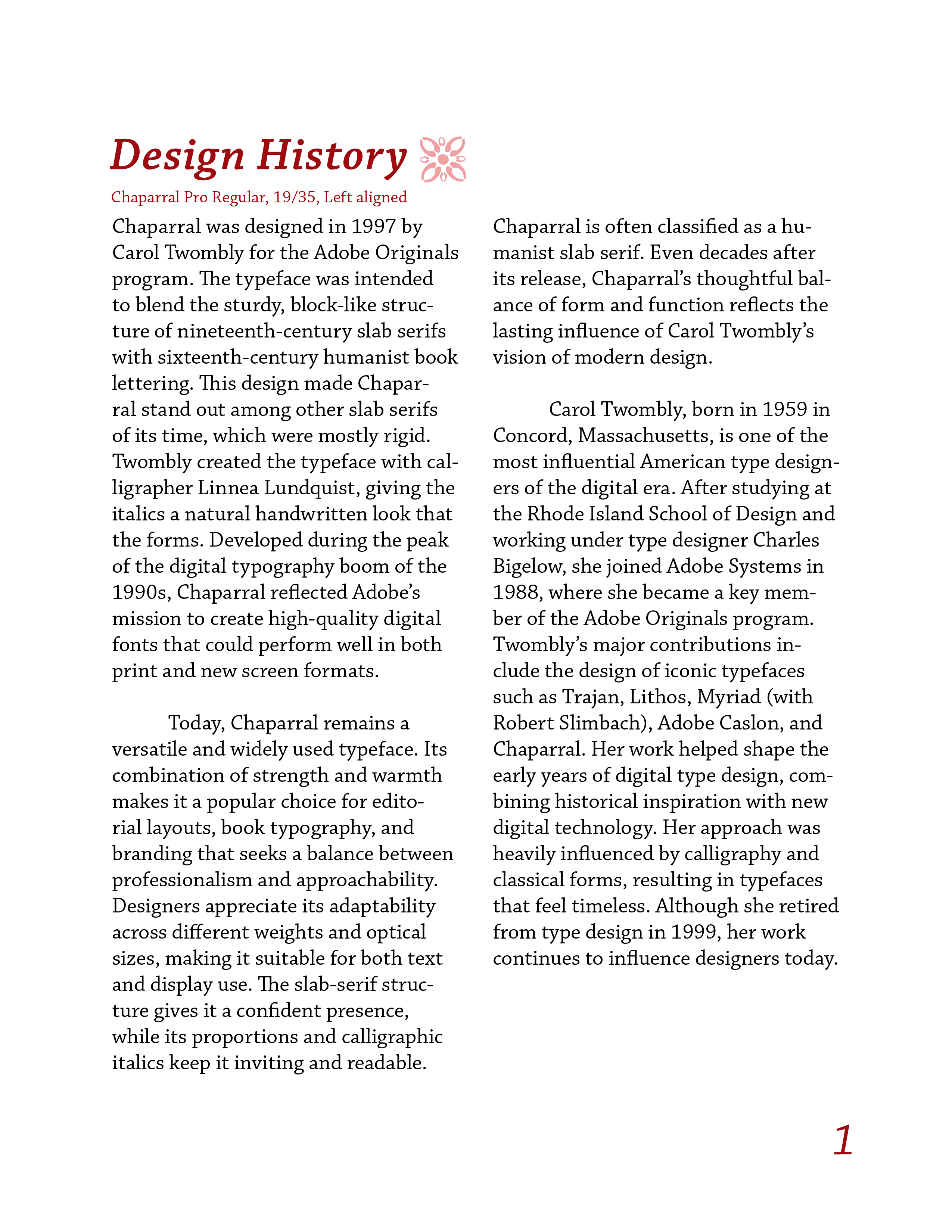 Carol Twombly also designed popular fonts like Trajan, Myriad, and Adobe Caslon.